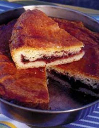 “Ripe black cherries from Ixtassou in rugged French Basque country are picked every Summer and immediately preserved for use throughout the year. Sour cherry preserves are served often with cheese and bread or as a filling in this moist cake. Use sour cherry preserves made in France, if you can find them. Otherwise use black cherry jam.”